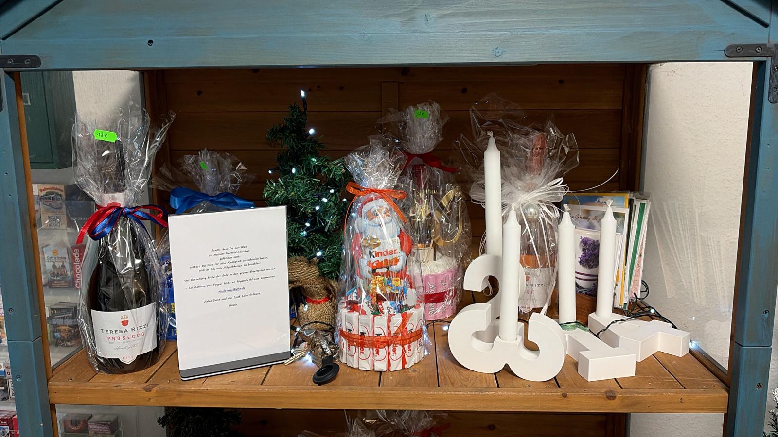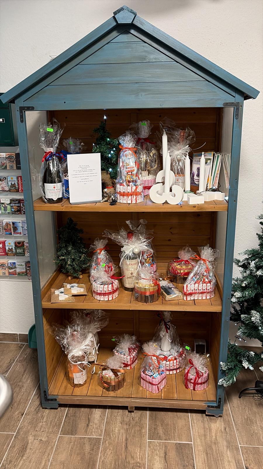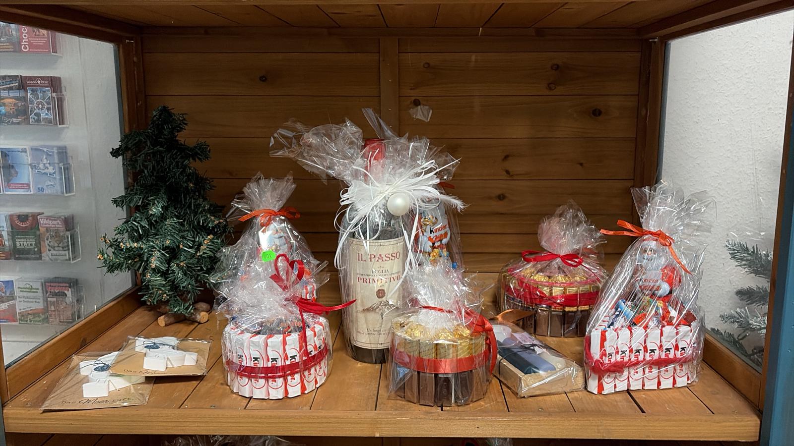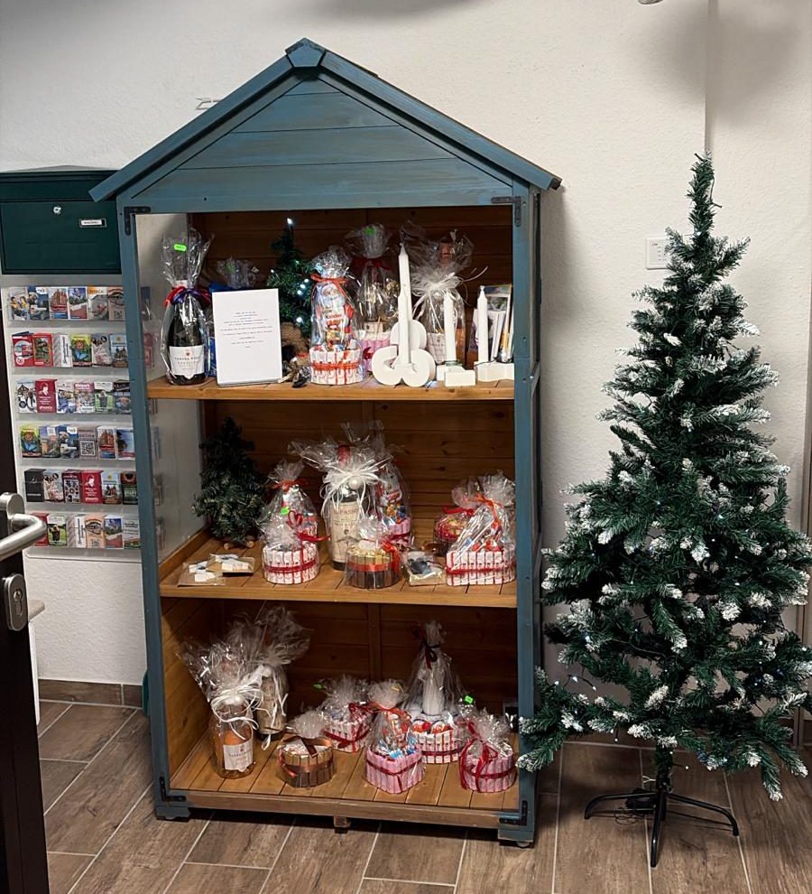 In unserem kleinen Verkaufshäuschen, dass sich in der Rezeption befindet, haben Sie verschiedene Artikel für jeden Anlass zur Auswahl. Stöbern Sie gern in unserem Sortiment!